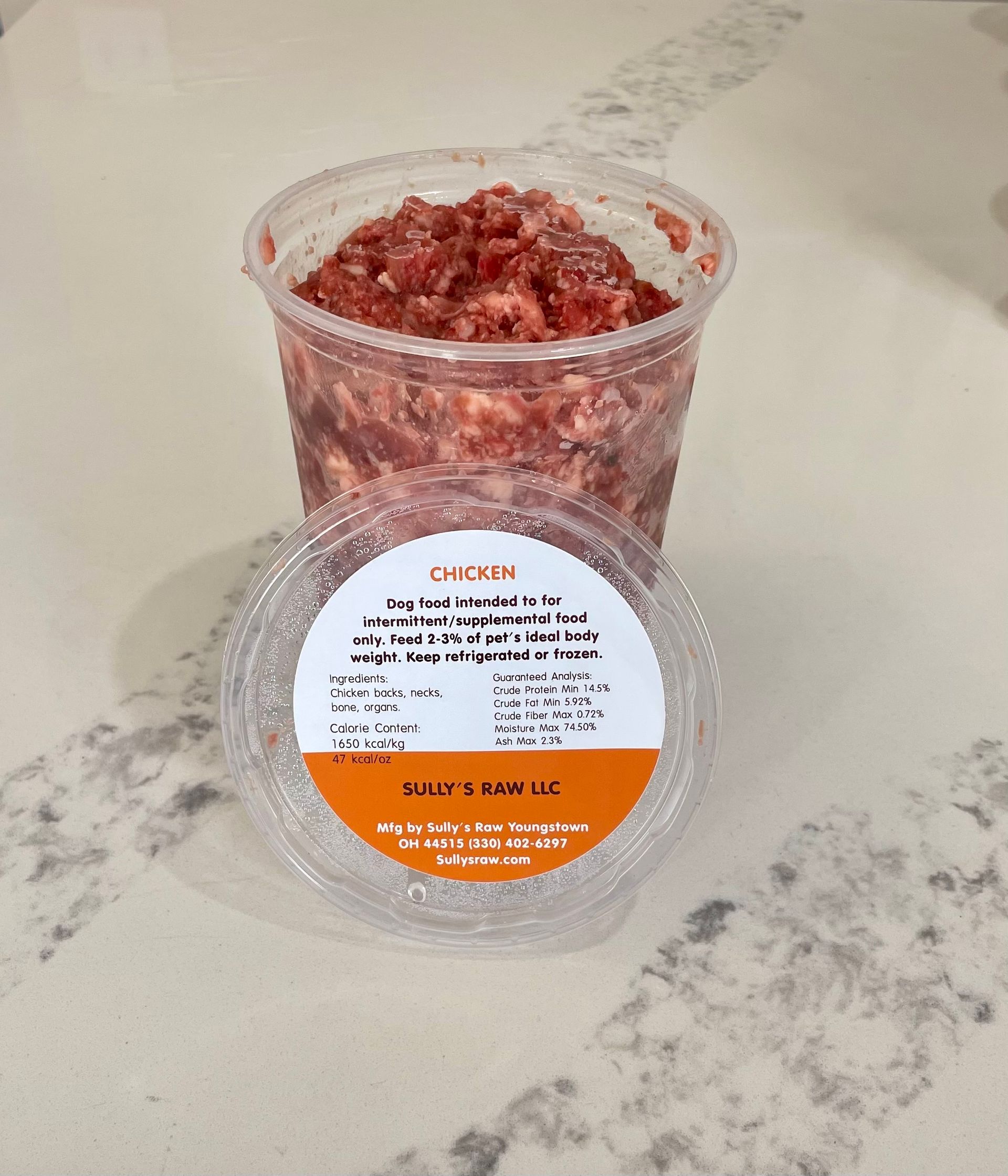 Ingredients: Chicken backs & necks (including bone), organs. Intended for supplemental feeding. Feed 2-3% of pet's ideal body weight. Keep refrigerated or frozen.