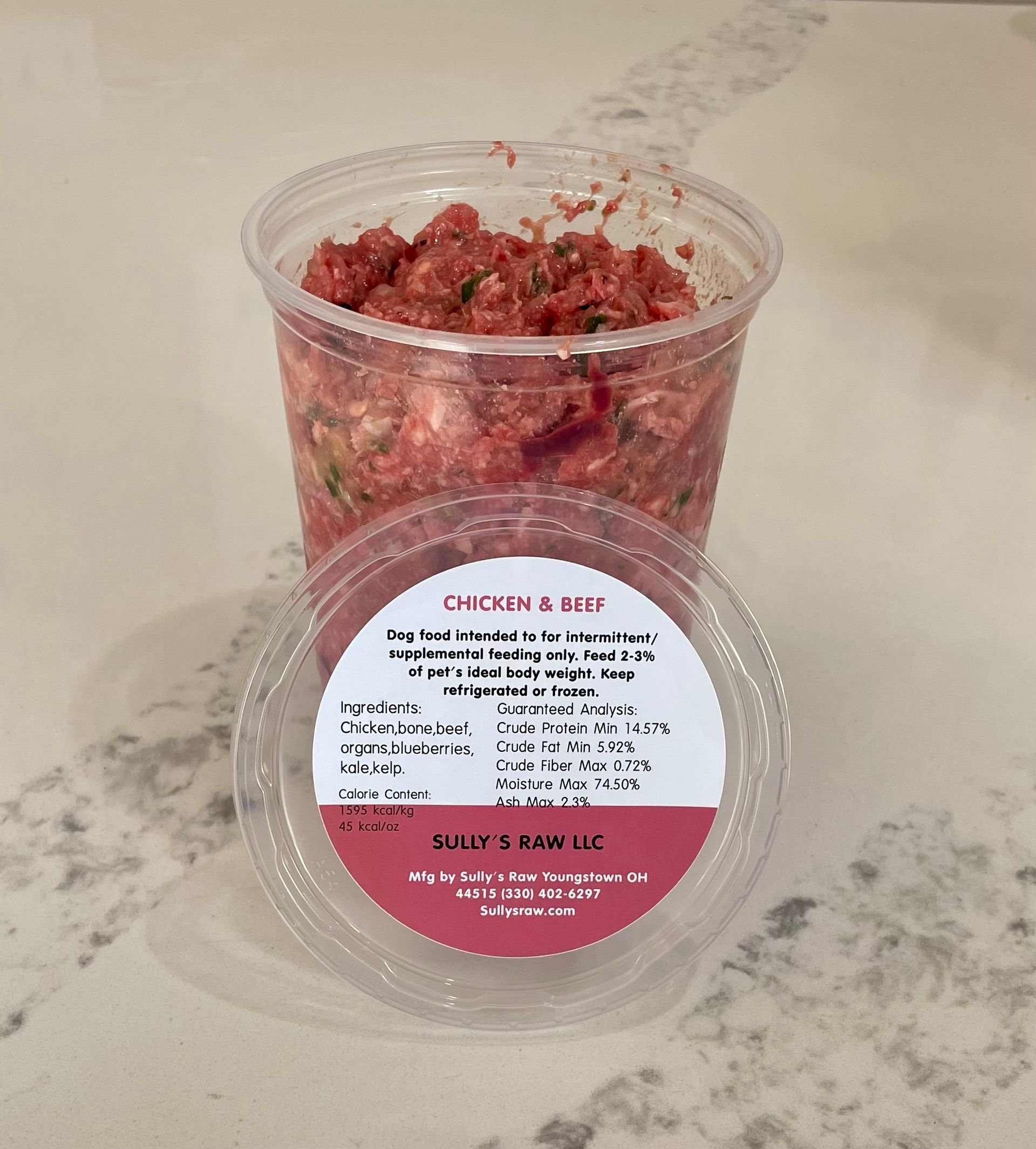 Ingredients: Chicken (including bone), beef, organs, kale, blueberries, kelp. Intended for supplemental feeding. Feed 2-3% of pet's ideal body weight. Keep refrigerated or frozen.